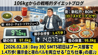 ダイエット 【2026.02.18|Day 39】SMTS初日はブース接客で1.4万歩!展示会と夜のバルを両立させる「立ち仕事」の底力