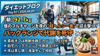 グルメ 【2026.04.07|Day 87】昼のフルチャージを夜の「超ヘルシー食」で迎え撃つ!バックランジで代謝を死守