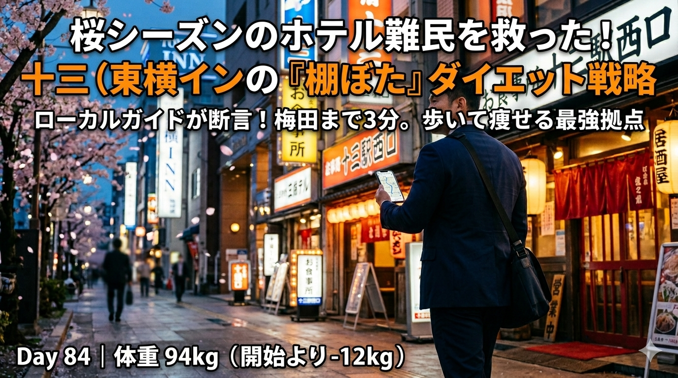 現在94kg。106kgから-12kgまで漕ぎ着け、2026年末の86kg到達を目指す私(ローカルガイド・レベル9)が、「たまたま空いていた十三の東横イン」で実践した、戦略的リカバリーをお届けします。