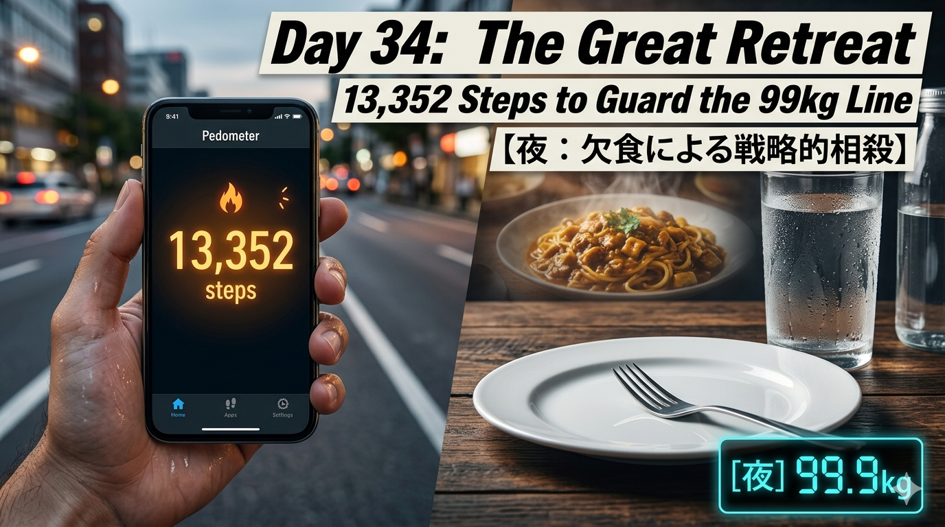 昼食・夕食の糖質と塩分の重なりにより、体内には一時的に水分が溜まりやすい状況です。しかし、1.3万歩という活動量と夜の欠食により、首の皮一枚で99kg台を死守したのは見事。現在、身体は代謝をフル稼働させて老廃物を流し出そうとしているフェーズです。