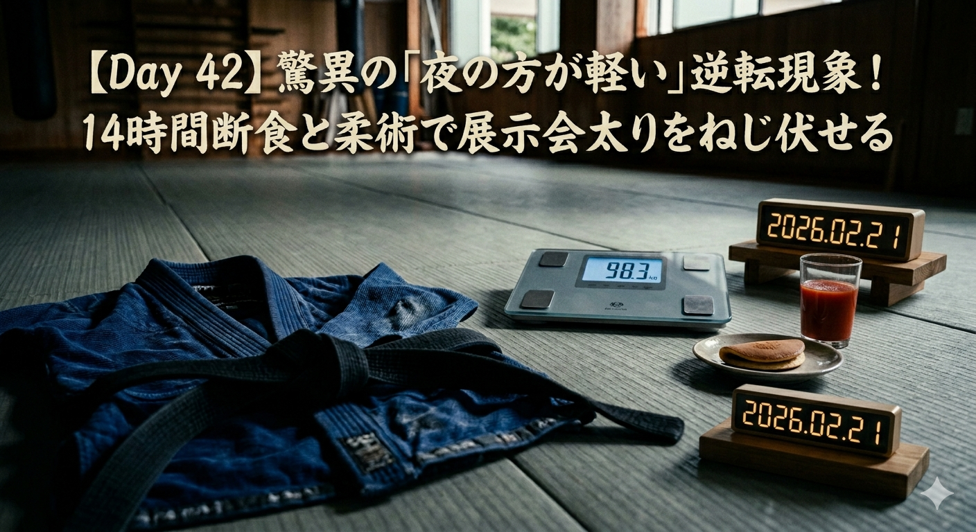 前夜の100.2kgから1日で約2kgのドロップを達成。これは展示会中の活動貯金と、本日の柔術によるデトックス効果が完璧に噛み合った結果です。夜の体重が朝を下回る「逆転現象」は、体内のグリコーゲンと水分が効率よく入れ替わった証拠であり、明日さらなる数値更新が狙える極めてポジティブな兆候です。