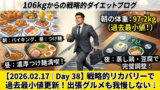 2月末に96.7kgまで到達した事実は、これまでの管理が正しかった証拠です。夜のイタリアンによる増量は「脂肪」ではなく、糖質と塩分が結びついた「水分」の保持。明日以降、再び食物繊維と水分摂取を意識すれば、この水分は速やかに排出され、再び最小値付近へと戻る安定したサイクルの中にいます。