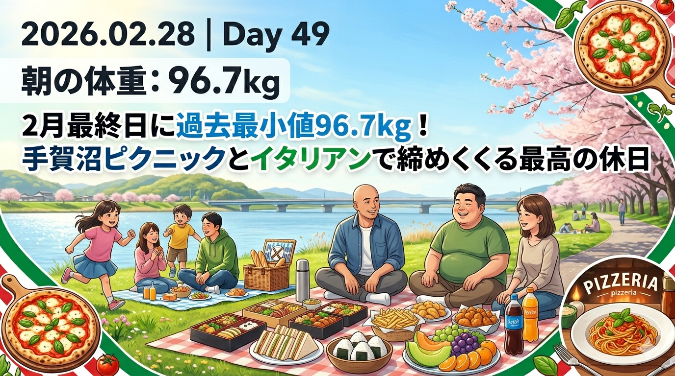 【2026.02.28|Day 49】2月最終日に過去最小値96.7kg!手賀沼ピクニックとイタリアンで締めくくる最高の休日