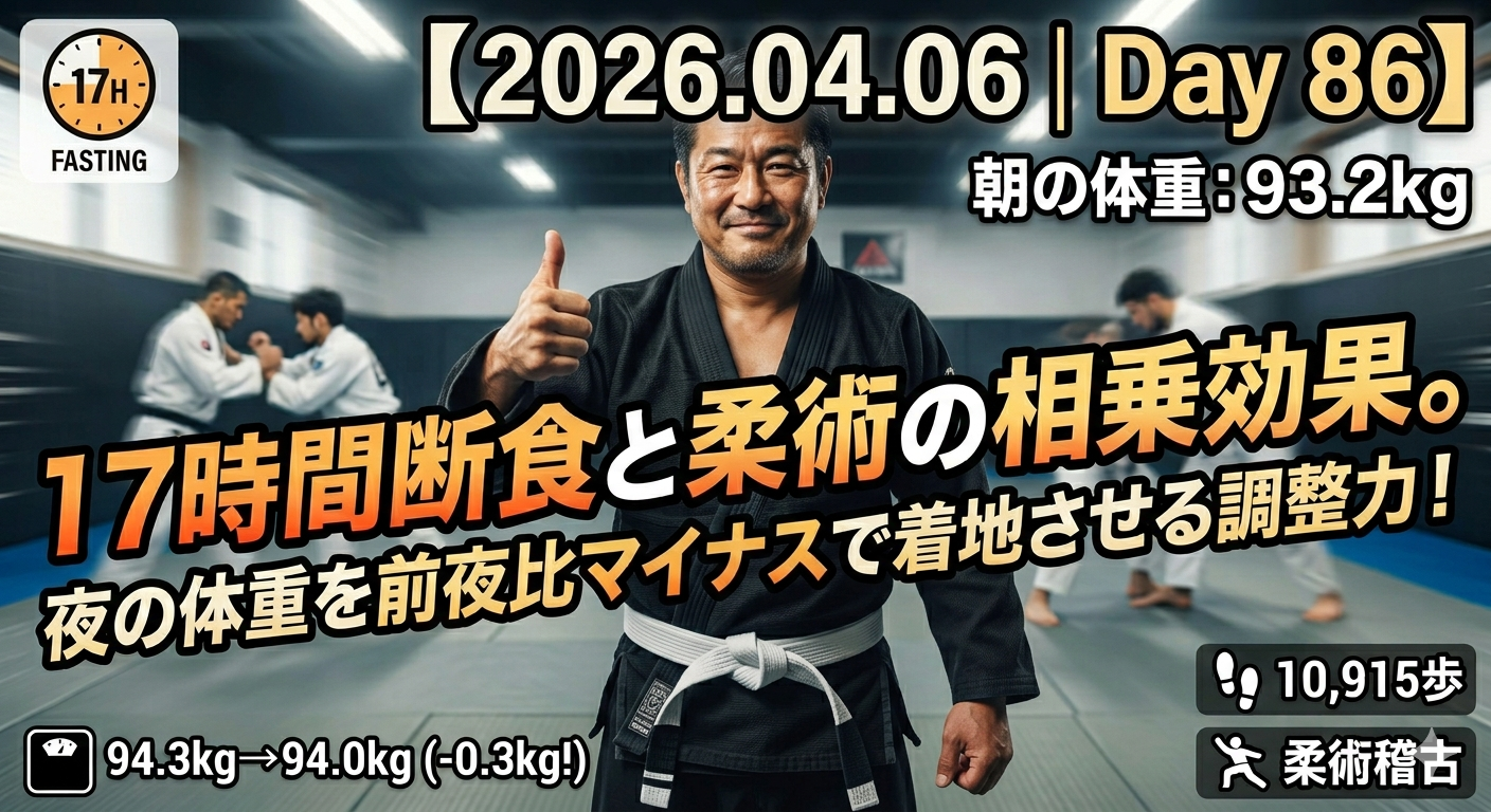 昨夜の94.3kgから、本日の夜は94.0kgへと着実に減少。これは1.1万歩の活動と柔術による消費が、摂取カロリーを上回っていることを示しています。特筆すべきは、食事制限だけに頼らず「断食の時間管理」と「運動の質」で帳尻を合わせている点。明日、朝の数値が再び92kg台へ戻るための盤石な布石です。