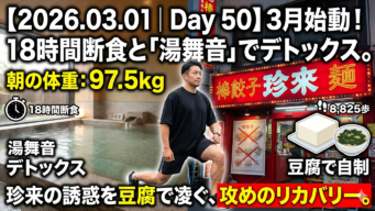 ダイエット 【2026.03.01|Day 50】3月始動!18時間断食と「湯舞音」でデトックス。珍来の誘惑を豆腐で凌ぐリカバリー