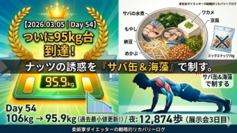 ダイエット 【2026.03.05|Day 54】ついに95kg台突入!展示会3日目、ナッツの誘惑を「サバ缶&海藻」で制する