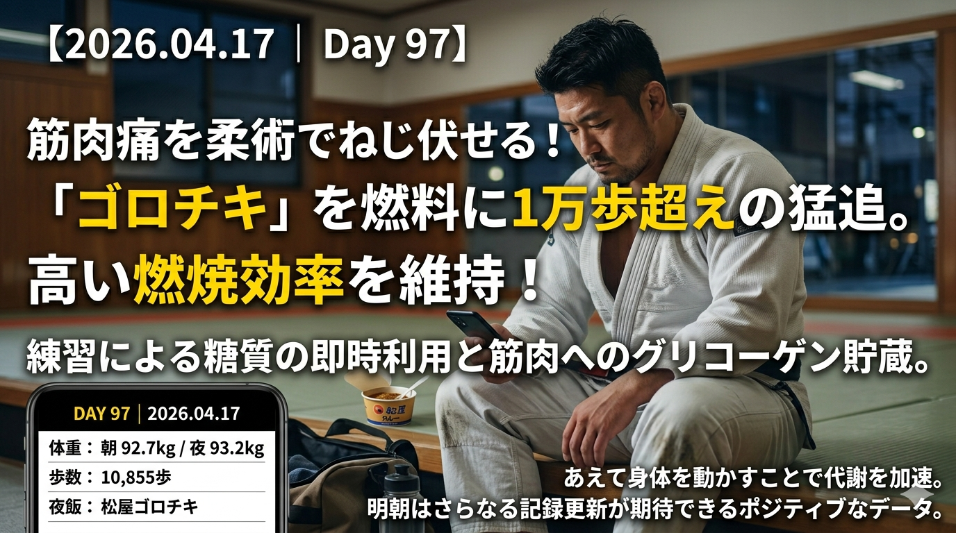 出張帰りの筋肉痛がピークを迎えるなか、あえて身体を動かすことで代謝を加速させたDay 97。練習前にしっかりとお腹が空いたため、歩数を確認した上で松屋のごろごろ煮込みチキンカレー(以下ゴロチキ)を投入。柔術の練習でエネルギーを使い切り、カレーを食べても安定した数値を維持した一日の記録です。