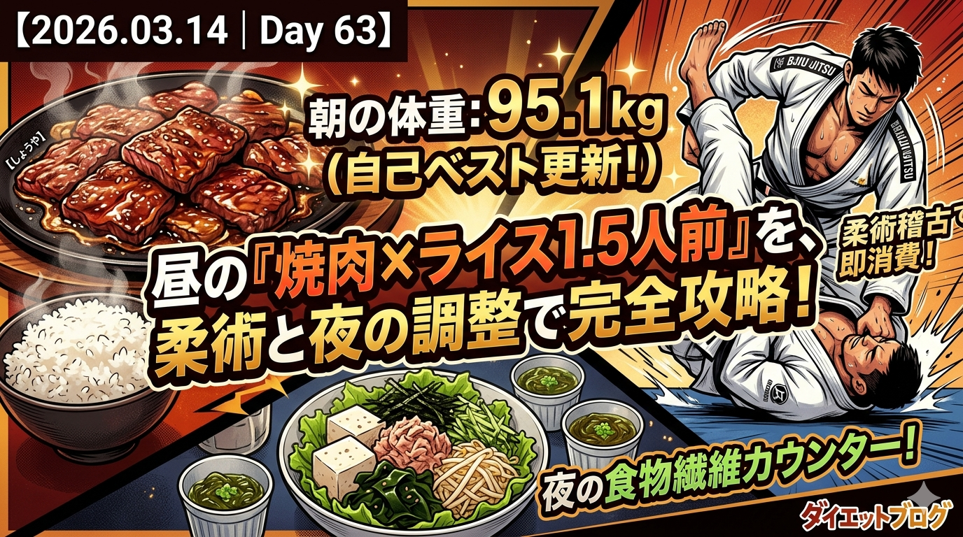 【2026.03.14|Day 63】自己ベスト95.1kg到達!昼の「焼肉×ライス1.5人前」を柔術と夜の調整で完全攻略