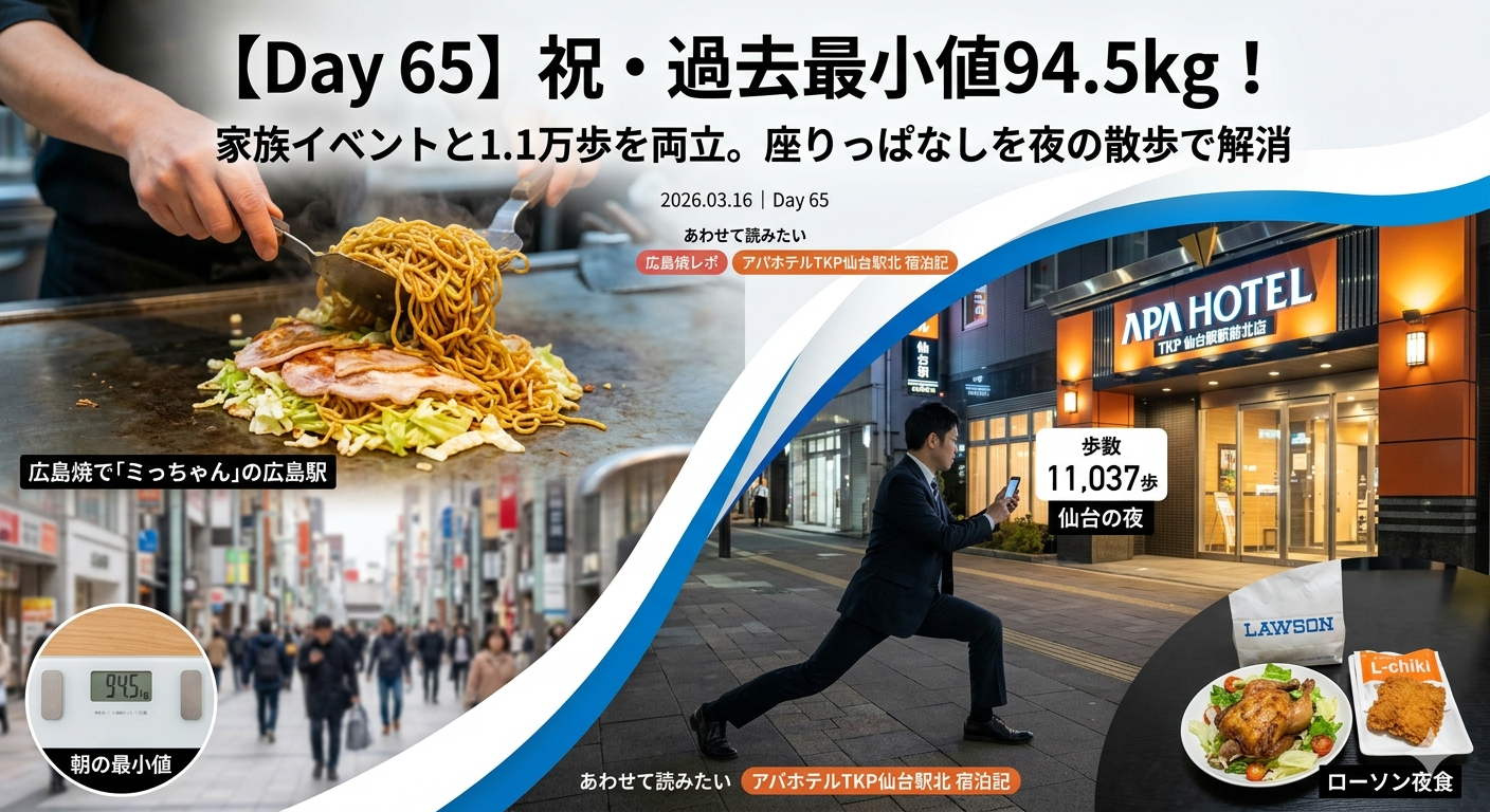 最小値を更新した直後の出張移動はハードですが、1.1万歩超えという数字が代謝の低下を防いでいます。夜に測定こそありませんが、夕食の糖質カットと移動の歩数から推測すると、昼の広島焼の熱量はすでに相殺されている可能性が高いです。明朝のホテルの朝食ブッフェに向けて、理想的な「空腹状態」と「代謝モード」が仕上がっています。