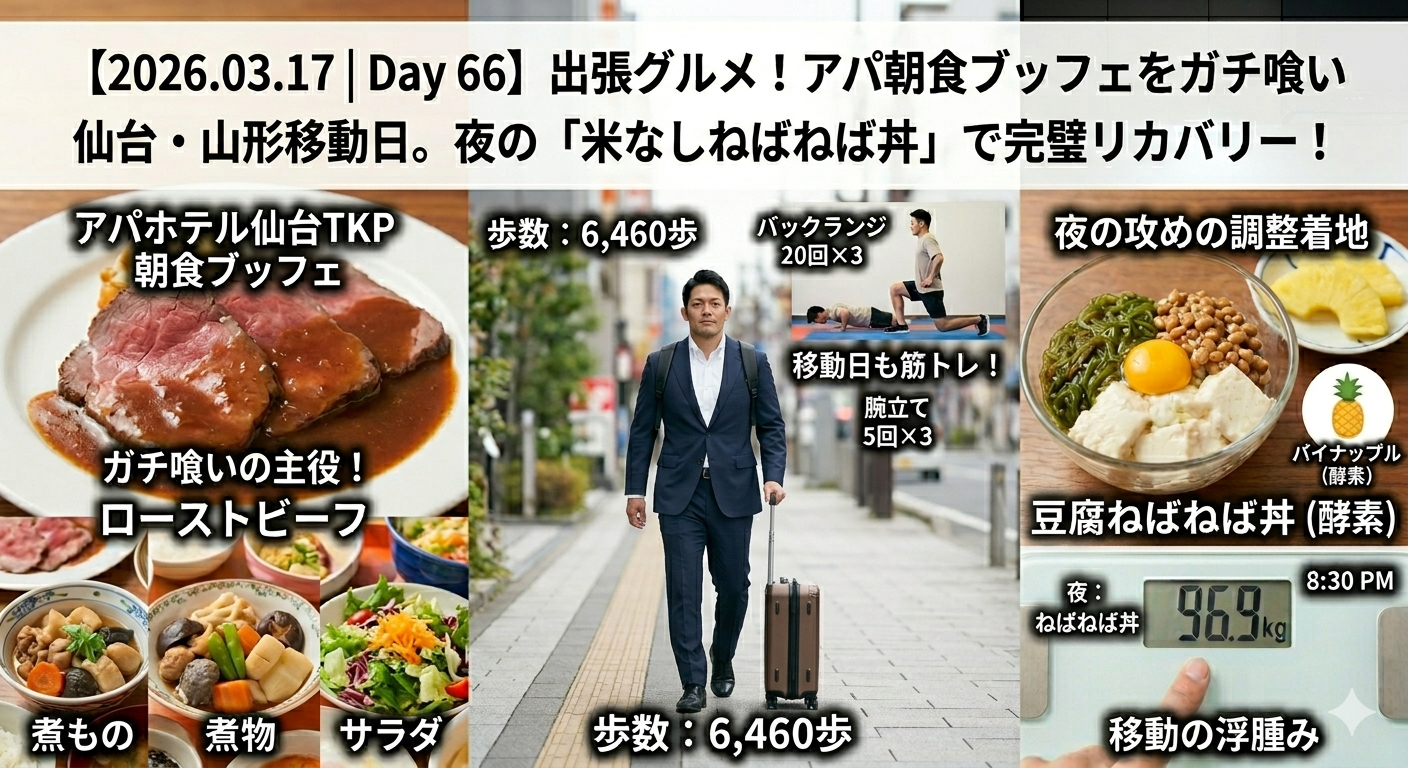 【2026.03.17|Day 66】仙台・山形出張!アパの朝食ブッフェ「ガチ喰い」からの夜の「米なしねばねば丼」で完璧リカバリー