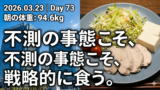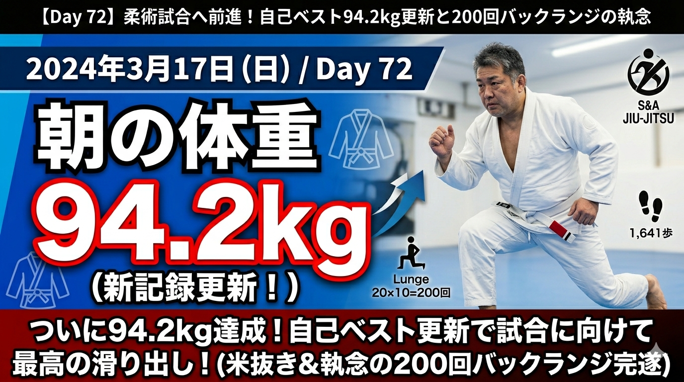 日曜日の朝、ついに94.2kgをマーク!自己ベストを更新し、4月26日の柔術の試合に向けて最高の滑り出しです。歩数は伸び悩みましたが、夜は「米抜き」を徹底し、昨日の2倍となる「バックランジ20回×10セット(200回)」を完遂。試合まで残り1ヶ月以上あるこの時期に、代謝をMAXまで引き上げ、盤石のコンディションを築くDay 72の記録です。