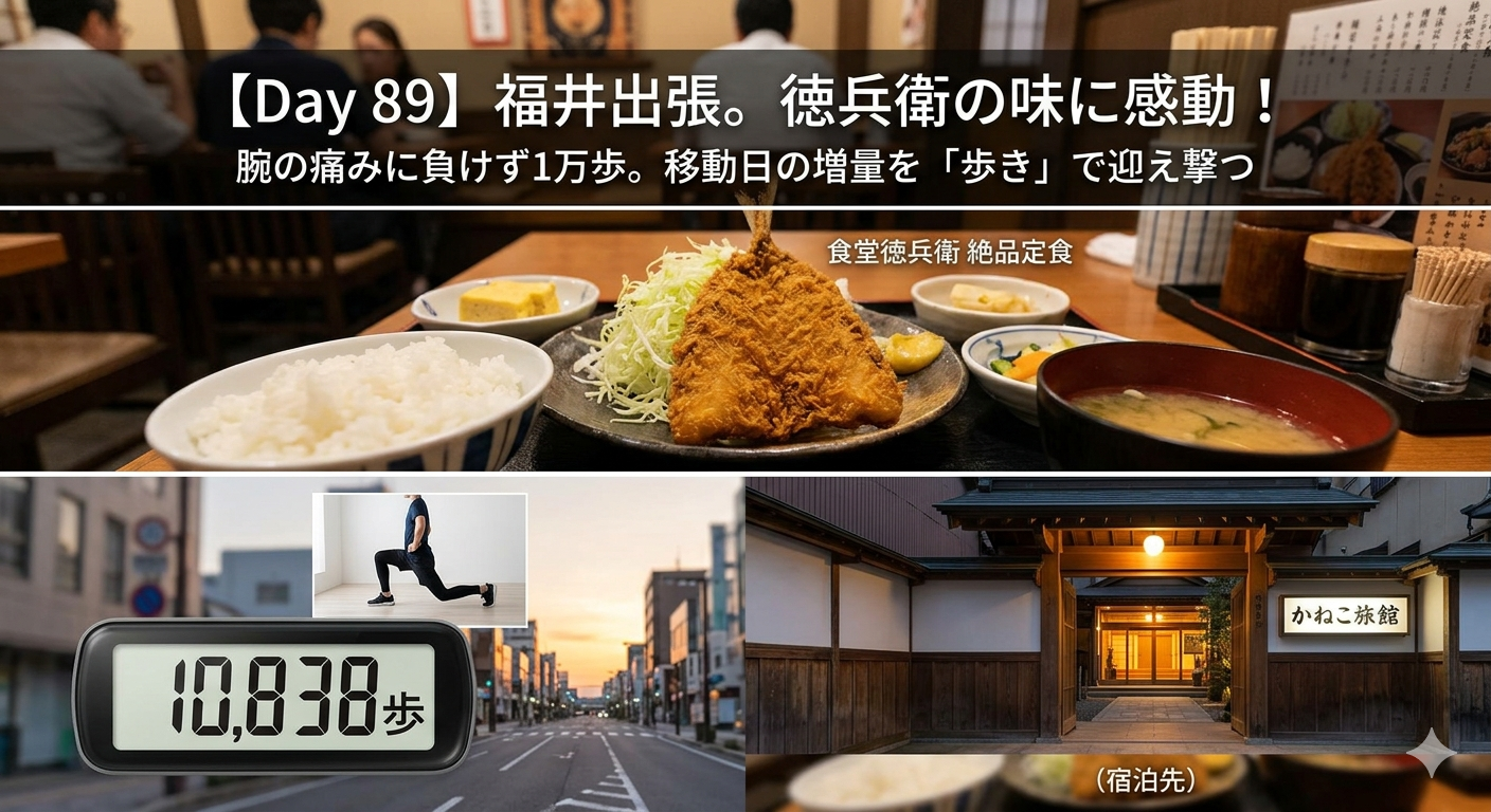 福井への出張移動日。肘の痛みに不安を抱えつつも、現地での1万歩ウォーキングと筋トレは欠かしません。夜は福井の名店「徳兵衛」で英気を養いました。
