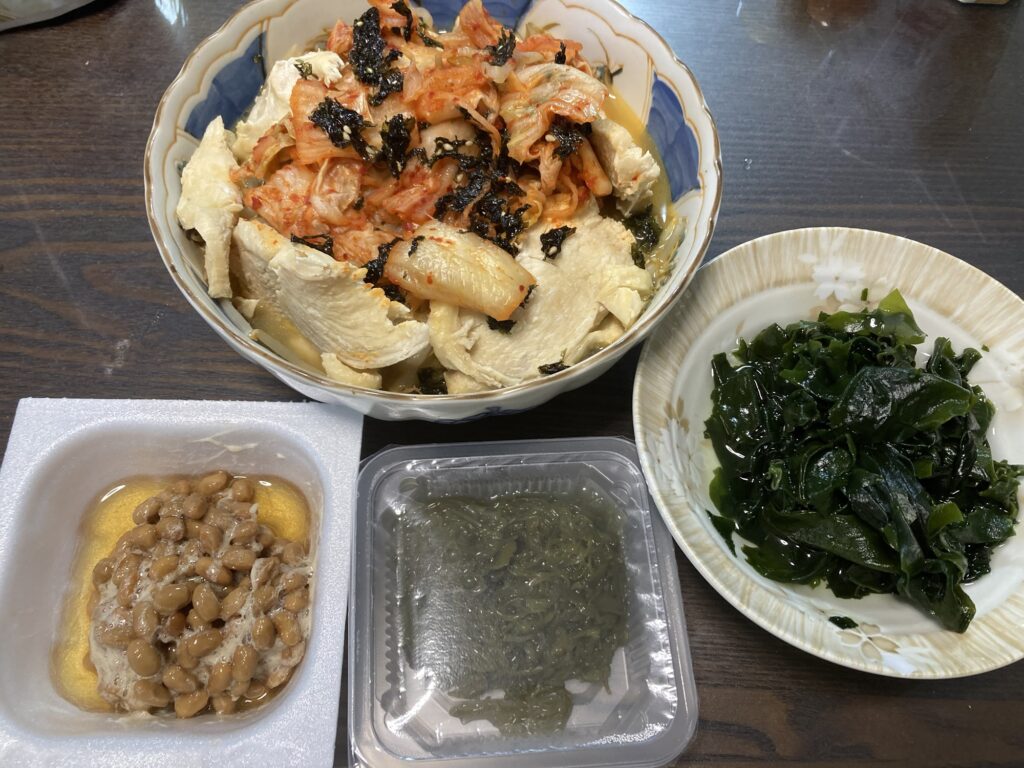 • [朝] 蒸し鶏キムチ和え(豆腐・もやし入り)、納豆、めかぶ、わかめ