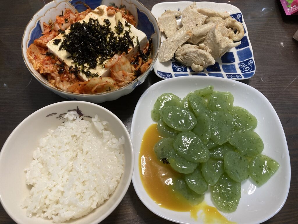 • [昼] 白米、刺身こんにゃく、冷奴キムチ乗せ、蒸し鶏