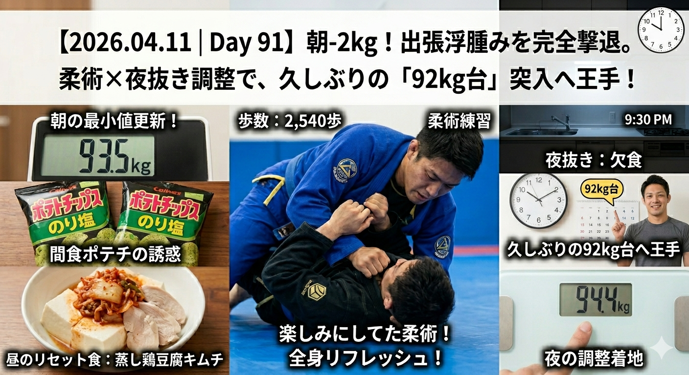 【2026.04.11|Day 91】朝−2kg!出張浮腫みを完全撃退。ポテチ×夜抜きのメリハリと、楽しみにしてた柔術でリフレッシュ!