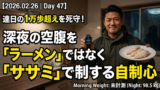朝の95.4kg到達は、非常に大きな進歩です。夜の97.2kgは大幅増に見えますが、これは「実家の愛情」による一時的な保水現象。日中の9,000歩超えとバックランジにより代謝のベースは高いままなので、明日の食事調整(断食や低糖質食)によって、火曜日までには再び95kg台へ戻せる良好なコンディションです。