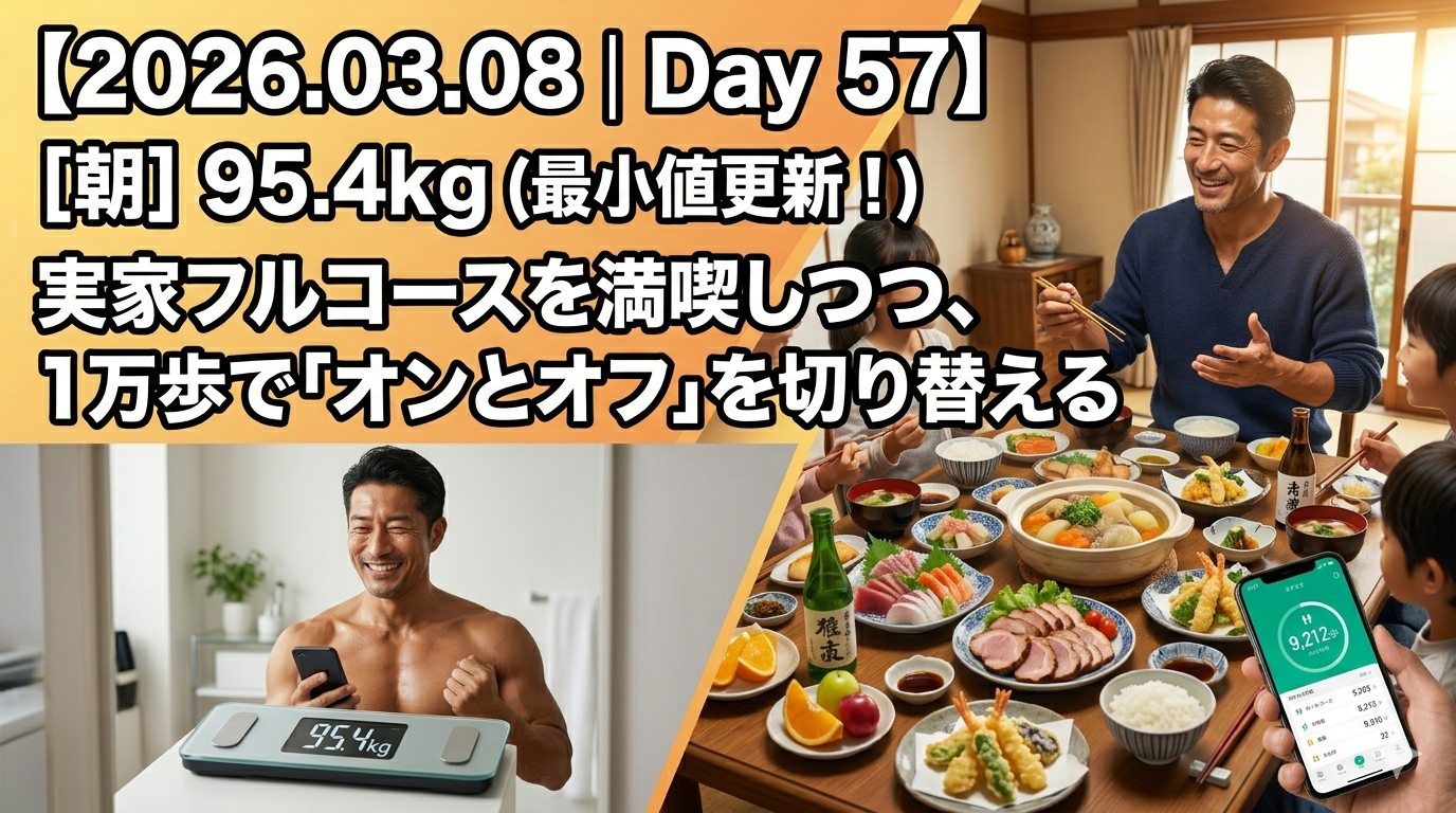 日曜日の朝、ついに95.4kgという過去最小値を記録。日中は実家でのご馳走を存分に楽しみ、夜の数値は一時的に上昇しましたが、1万歩弱の活動量と筋トレを継続。明日からの「月曜の戻し」に向けた活力チャージを完了しました。