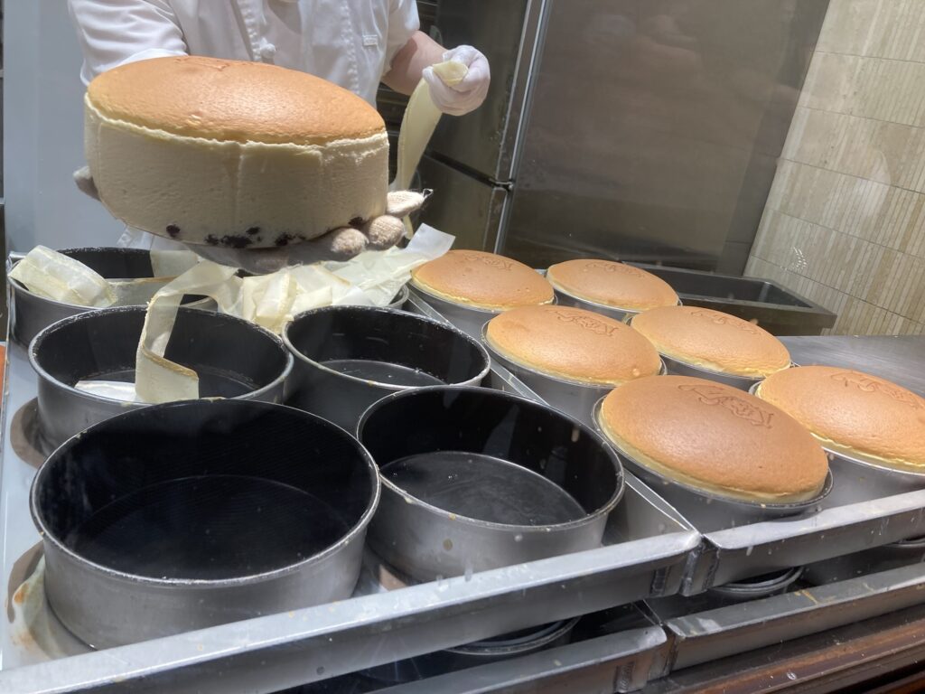 目の前で次々とチーズケーキが焼き上がり、「チリンチリン」という鐘の音とともに、おじさんの刻印が押されていくライブ感は圧巻です。