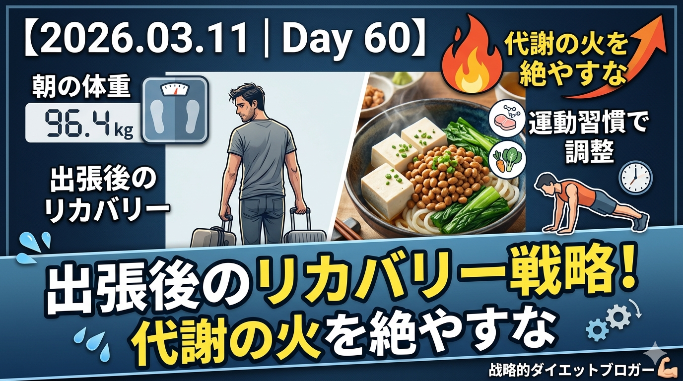 出張の影響と間食の摂取により、夜の数値は97kg台後半となっています。しかし、夕食の「豆腐2パック+オクラめかぶ」という高いデトックス効果が期待できるメニューと、継続している筋トレの相乗効果は無視できません。明朝、しっかり水分が排出されれば、再び96kg台前半での安定が見えてきます。