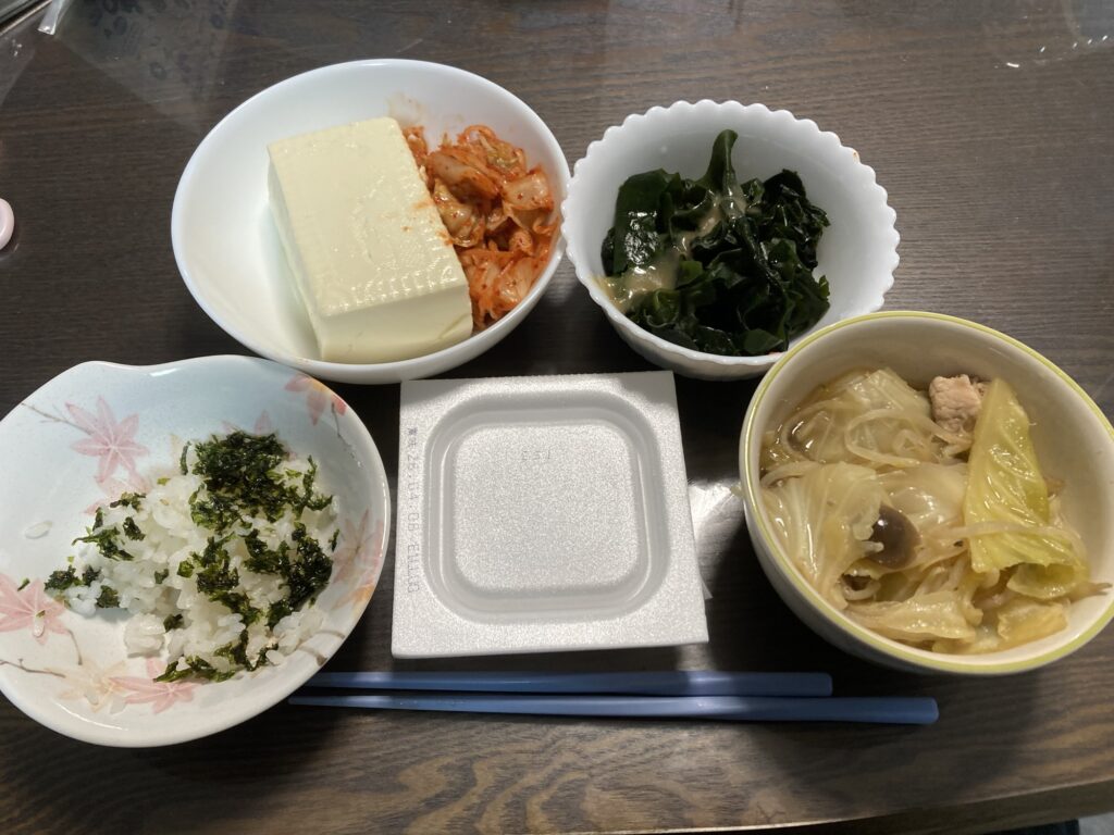• [朝] ご飯、納豆、豆腐キムチ、わかめ、野菜と豚肉のスープ(自宅)