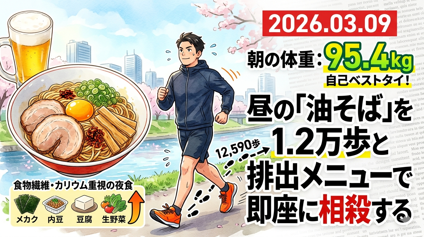 【2026.03.09|Day 58】自己ベストタイの朝!昼の「油そば」を1.2万歩と排出メニューで即座に相殺する