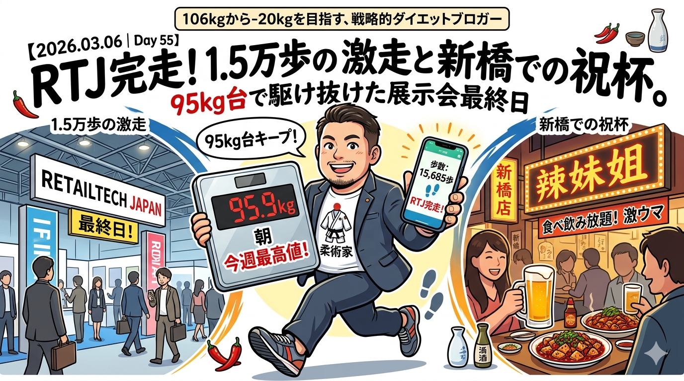 展示会リテールテックジャパン(RTJ)最終日。今週最高となる1.5万歩超えの圧倒的な活動量を記録。朝の95.9kgを守り抜き、夜は新橋での飲み会で4日間の激闘を労いました。