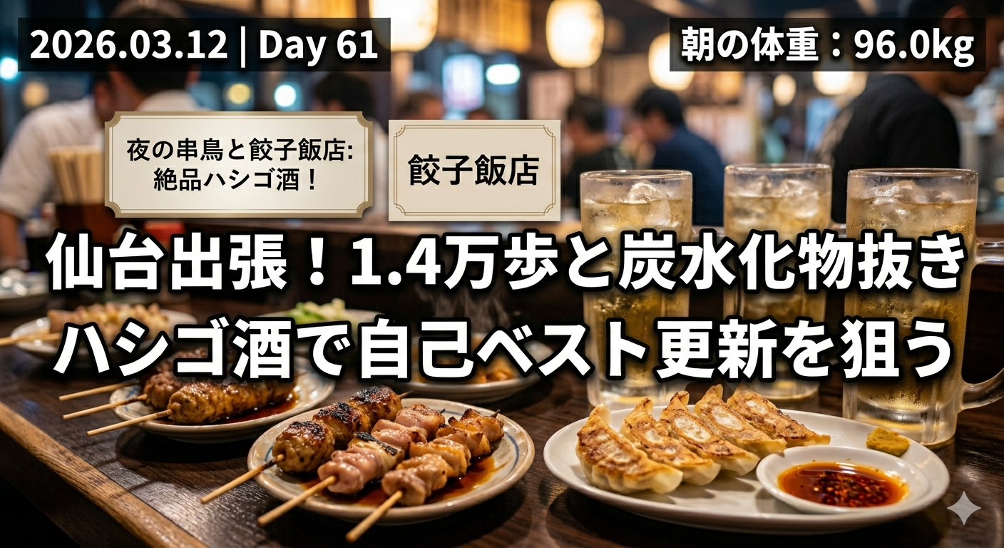 仙台出張2日目。昨日稼いだ活動量と「炭水化物ゼロ」の勢いをそのままに、95kg台への再突入、そして自己ベスト更新を視野に入れて調整を継続します!