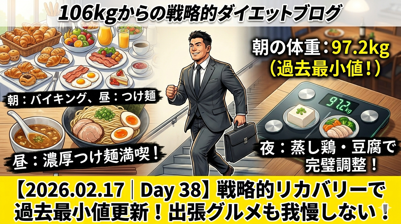 朝の97.2kgから、バイキングとつけ麺を経て夜の増量を1.2kgに抑制できたのは、夜の徹底した調整による成果です。出張帰りの浮腫みやすい状況下で98kg台前半に踏みとどまったのは、9,300歩の運動量と夜のデトックス食がうまく機能した結果と言えます。